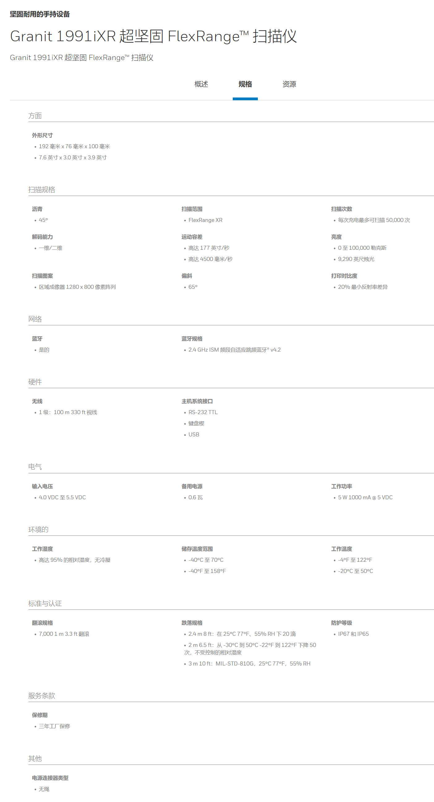 继成功部署的传统之后,下一代 Granit™ XP 扫描仪扩展了功能并重新定义了超坚固的扫描。Granit™ XP 具有一流的 10' 跌落规格,经过精心设计,可在装载码头、叉车和拣货卡车跌落冲击后继续工作。1 米(3.3 英尺)的翻滚测试表明在日常敲击和从工作站或腰部高度跌落时的长期耐用性。一流的 7,000 次滚动规格确保 Granit™ 扫描仪可以长期工作。并且 IP67 防尘和防潮密封可在严苛处理下保护扫描性能。借助 FlexRange 技术,Granit 1991iXR 型号从不牺牲近场扫描开始,并将其扩展到 1.5m (5 ft) 和 100 mil (2.54mm) 读取 UPC 代码10m (33 ft) 处的货架标签,无缝处理许多仓库/配送中心和制造工作流程。由于打印质量低或在处理过程中损坏,不良标签通常出现在仓库/配送中心和工业空间。Granit XP 建立在霍尼韦尔的下一代成像平台之上,可确保其他具有挑战性的标签不会在您的流程中造成瓶颈。Granit™ XP 1991iXR 型号为从接触式到顶部机架的扫描操作提供高耐用性、极高性能的扫描仓库。Granit™ XP 1991iXR 扫描仪专为需要高速扫描以最大限度提高生产力的应用而设计,并且在耐用性不可谈判以降低总拥有成本的应用中,提供了最佳解决方案。由于打印质量低或在处理过程中损坏,不良标签通常出现在仓库/配送中心和工业空间。Granit XP 建立在霍尼韦尔的下一代成像平台之上,可确保其他具有挑战性的标签不会在您的流程中造成瓶颈。Granit™ XP 1991iXR 型号为从接触式到顶部机架的扫描操作提供高耐用性、极高性能的扫描仓库。Granit™ XP 1991iXR 扫描仪专为需要高速扫描以最大限度提高生产力的应用而设计,并且在耐用性不可谈判以降低总拥有成本的应用中,提供了最佳解决方案。由于打印质量低或在处理过程中损坏,不良标签通常出现在仓库/配送中心和工业空间。Granit XP 建立在霍尼韦尔的下一代成像平台之上,可确保其他具有挑战性的标签不会在您的流程中造成瓶颈。Granit™ XP 1991iXR 型号为从接触式到顶部机架的扫描操作提供高耐用性、极高性能的扫描仓库。Granit™ XP 1991iXR 扫描仪专为需要高速扫描以最大限度提高生产力的应用而设计,并且在耐用性不可谈判以降低总拥有成本的应用中,提供了最佳解决方案。Granit™ XP 1991iXR 型号为从接触点到仓库顶部机架的扫描操作提供了高耐用性、极高性能的扫描。Granit™ XP 1991iXR 扫描仪专为需要高速扫描以最大限度提高生产力的应用而设计,并且在耐用性不可谈判以降低总拥有成本的应用中,提供了最佳解决方案。Granit™ XP 1991iXR 型号为从接触点到仓库顶部机架的扫描操作提供了高耐用性、极高性能的扫描。Granit™ XP 1991iXR 扫描仪专为需要高速扫描以最大限度提高生产力的应用而设计,并且在耐用性不可谈判以降低总拥有成本的应用中,提供了最佳解决方案。