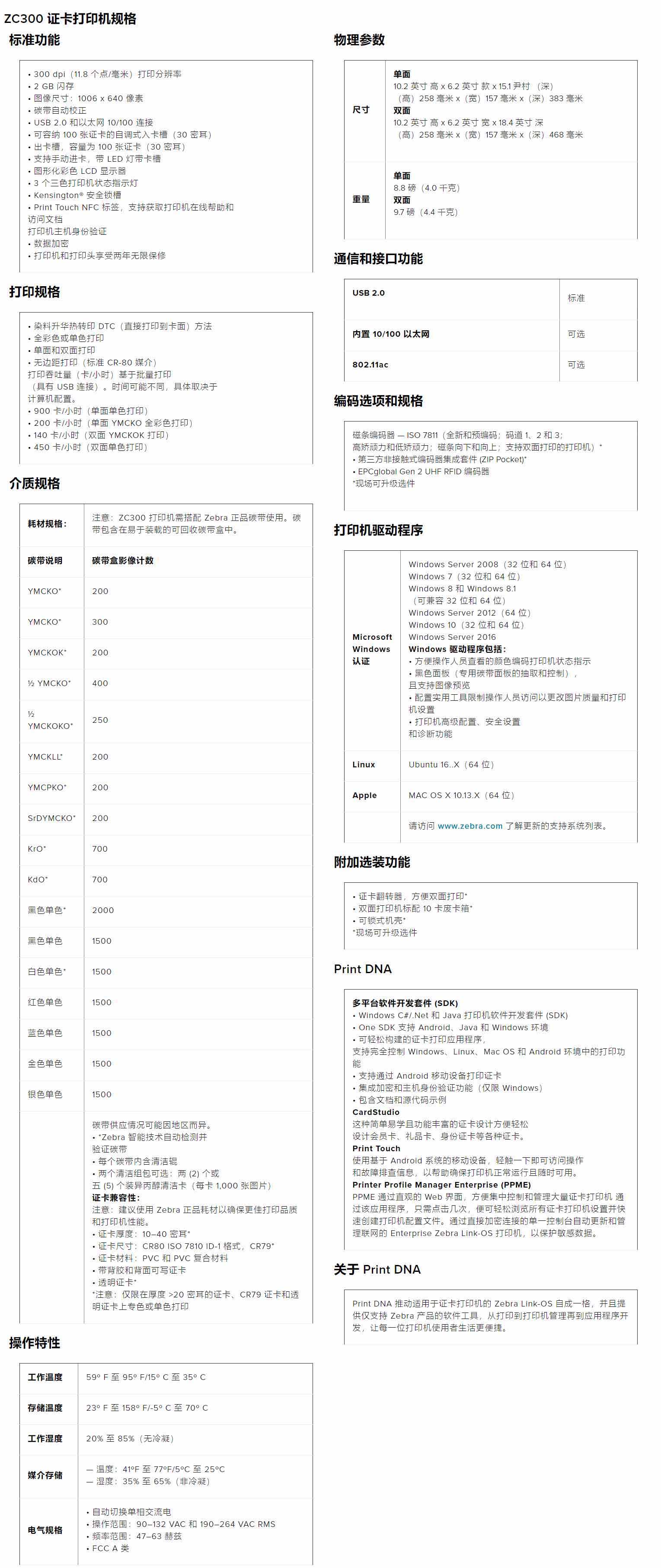 凭借 ZC300 突破性的简单易用,您可以随时随地打印您需要的证卡。您可以利用提供特殊颜色和特殊效果的新型碳带,打印单面或双面边到边彩色或黑白证卡。您可以通过精妙的工程设计实现按钮式证卡打印,消除通常与证卡打印相关的几乎所有难题。此类打印机采用随处适用的精巧设计,让您随时随地根据需要轻松添加证卡打印。而 Print DNA 提供一系列高价值解决方案,使得将证卡打印集成到应用程序中、设计证卡和支持打印机比以往更加简单。