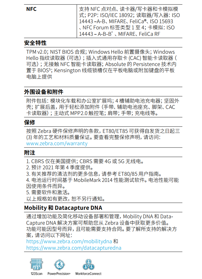 可选热插拔 3400mAh、7.6V(25.8 瓦时)备用电池(需要扩展后盖)