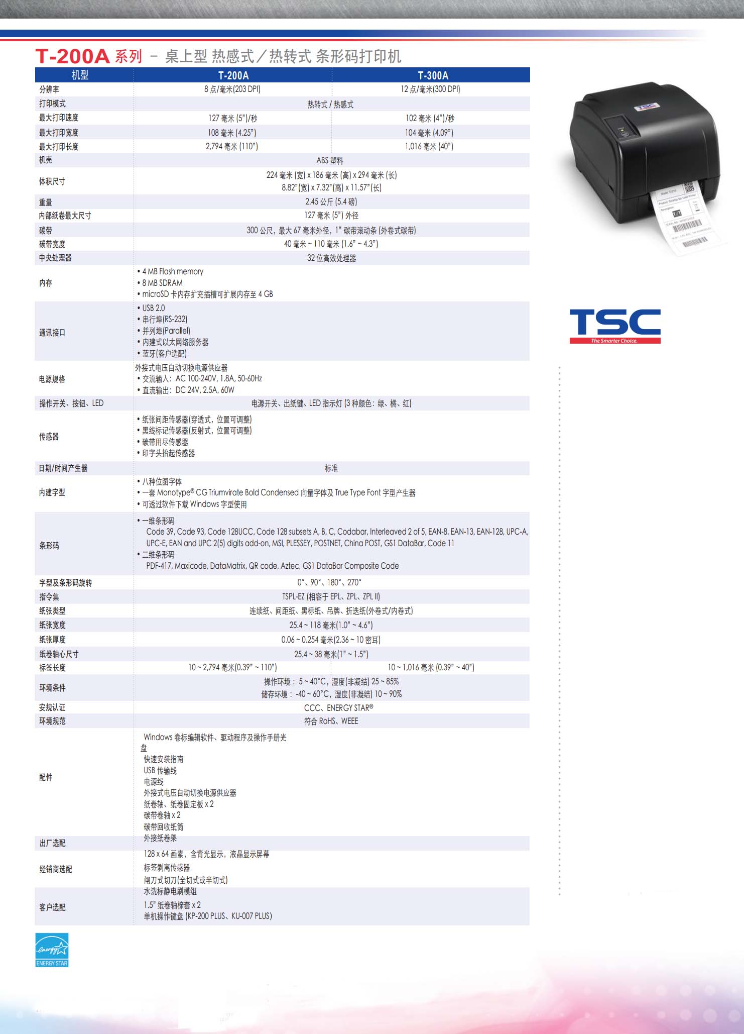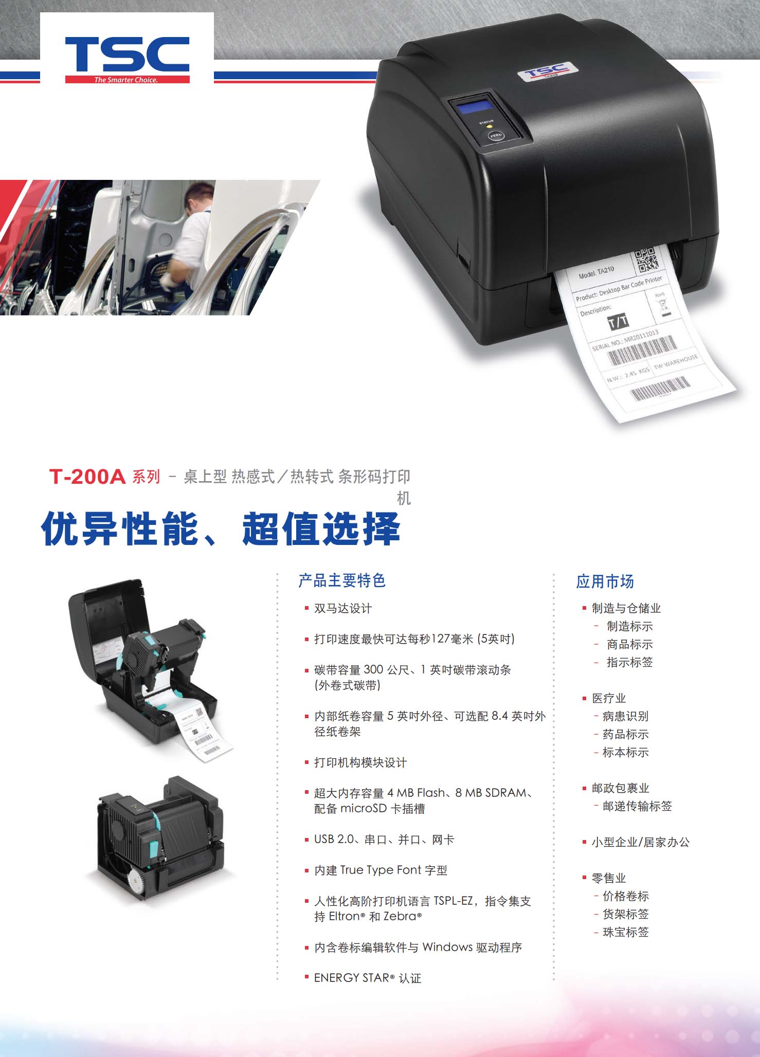 T-200A 系列 4英吋 桌上型 热感式/热转式 条形码打印机