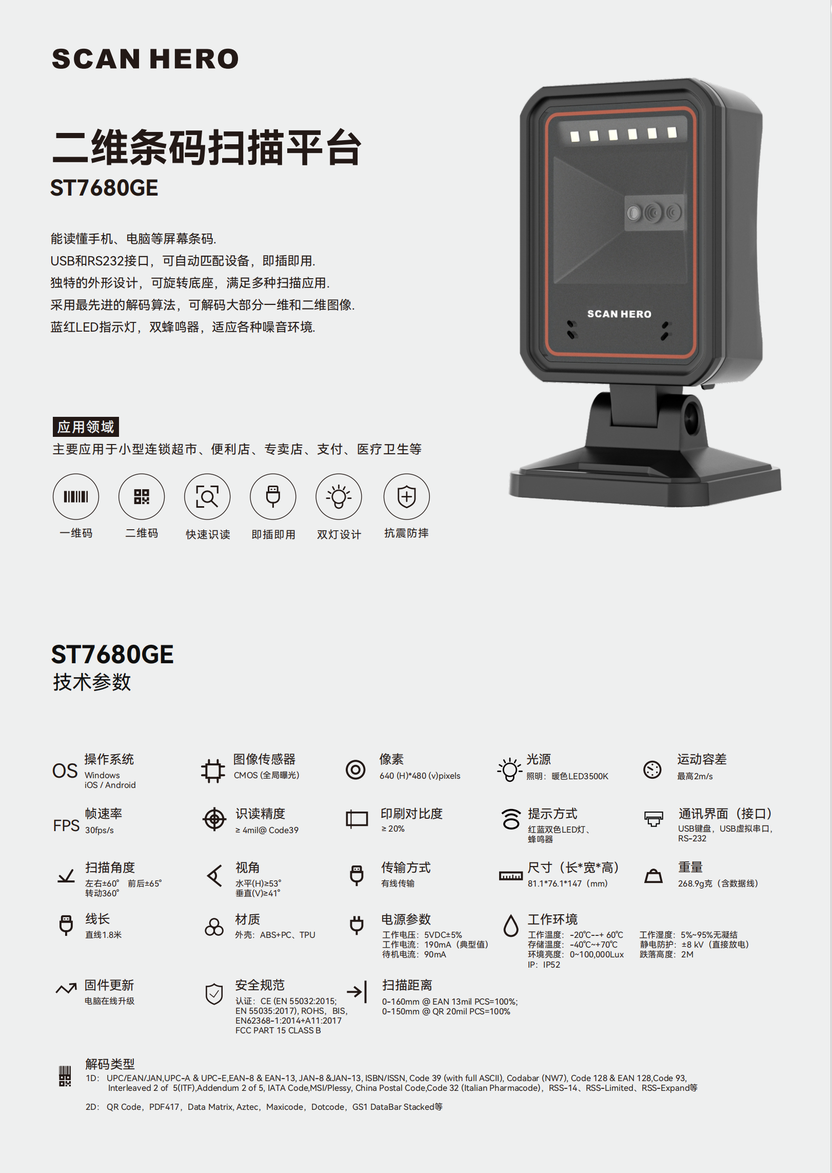 Scanhero ST7680GE 桌面二维条形码扫描器