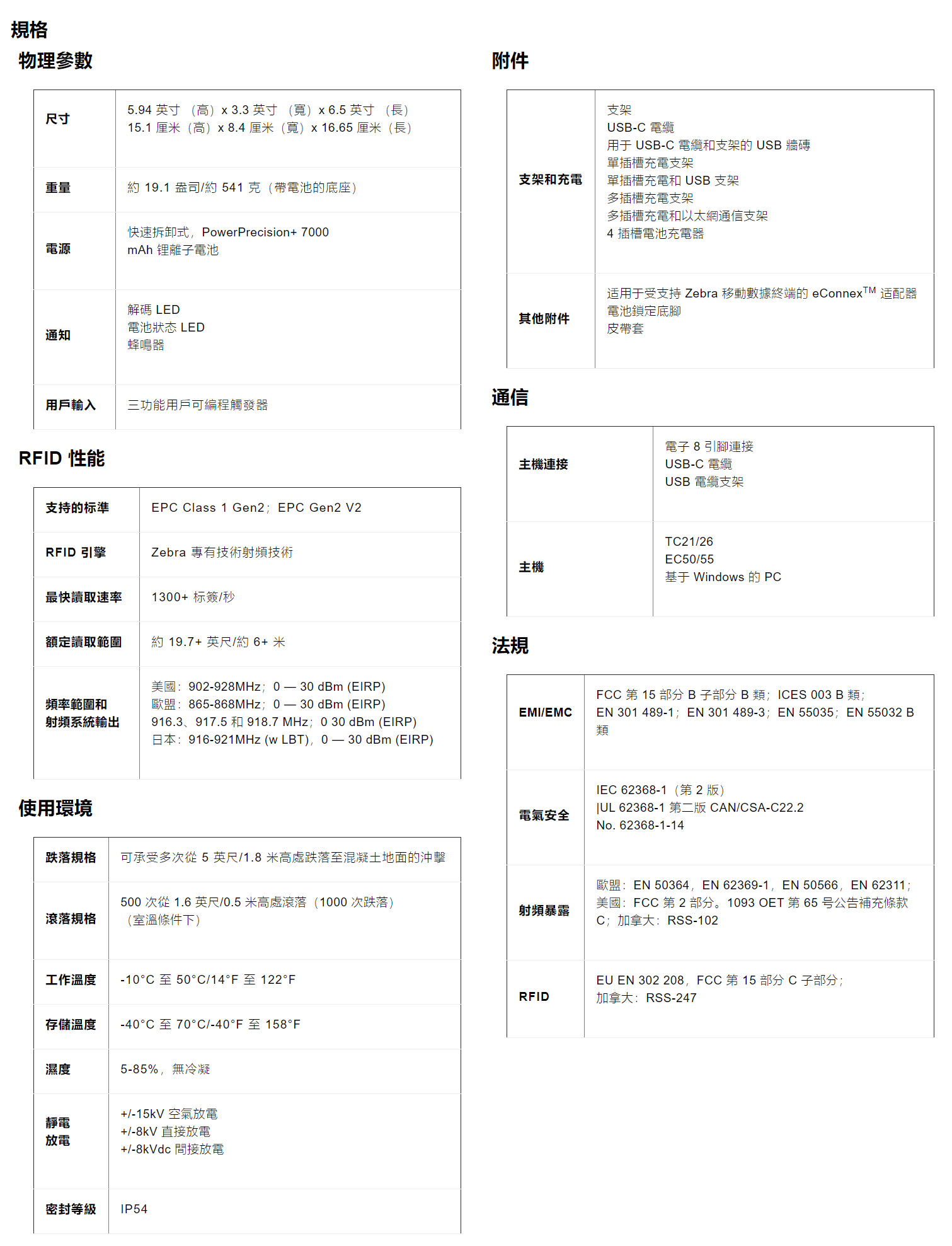 Zebra 設備能夠耐受各種日常環境條件。RFD40 底座可承受從 5 英尺高度跌落至混凝土地面的衝擊,可承受 500 次從 0.5 米/1.6 英尺高處滾落的衝擊,能夠完全應對現實情況中的各種撞擊和顛簸。這款產品具有 IP54 防塵防水等級的密封功能,支援 -10°C 至 50°C/14°F 至 122°F的更大工作溫度範圍。憑藉這些耐用性特性,可確保 RFD40 底座能夠滿足您工作場所的苛刻需求,讓您安心無憂。