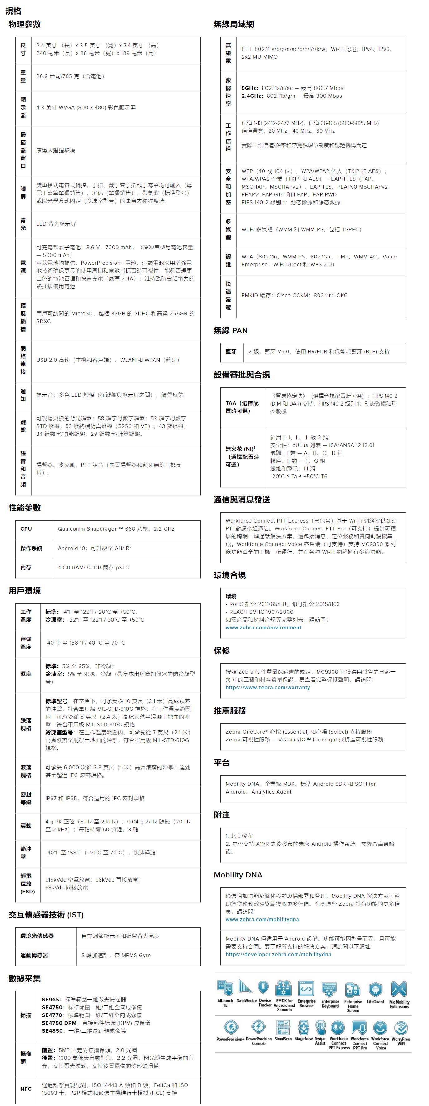 每天,有三百多萬工作人員使用 MC9000 系列移動資料終端簡化全球倉庫和製造工廠的流程。現在您每天都需要以前所未有的速度處理更多的訂單,發運更多的貨物。引進移動資料終端,一切問題迎刃而解,MC9300 是全球熱銷且值得信賴的企業移動資料終端的又一次革新。該產品使用工作人員已經熟悉的 Android 作業系統,高級觸控大屏等配置,可為工作人員提供極簡體驗。其一流的處理能力和記憶體足以應對您所有的應用程式。新的資料獲取功能包括可選的前後攝像頭、出色的掃描範圍以及卓越的直接部件標識 (DPM) 採集。新電池單次充電後的續航時間是 MC9200 的兩倍。該產品是有史以來最耐用的 MC9000 系列產品,其持久性在各種環境(包括冷凍環境)下均超越了幾乎所有同類設備。新型 Mobility DNA 解決方案可確保設備、作業系統的安全,簡化電池管理,同時可實現更勝以往的可靠無線連接。既然可以開箱即用方式運行您現有的 TE 應用,那遷移到 Android 再簡單不過了。