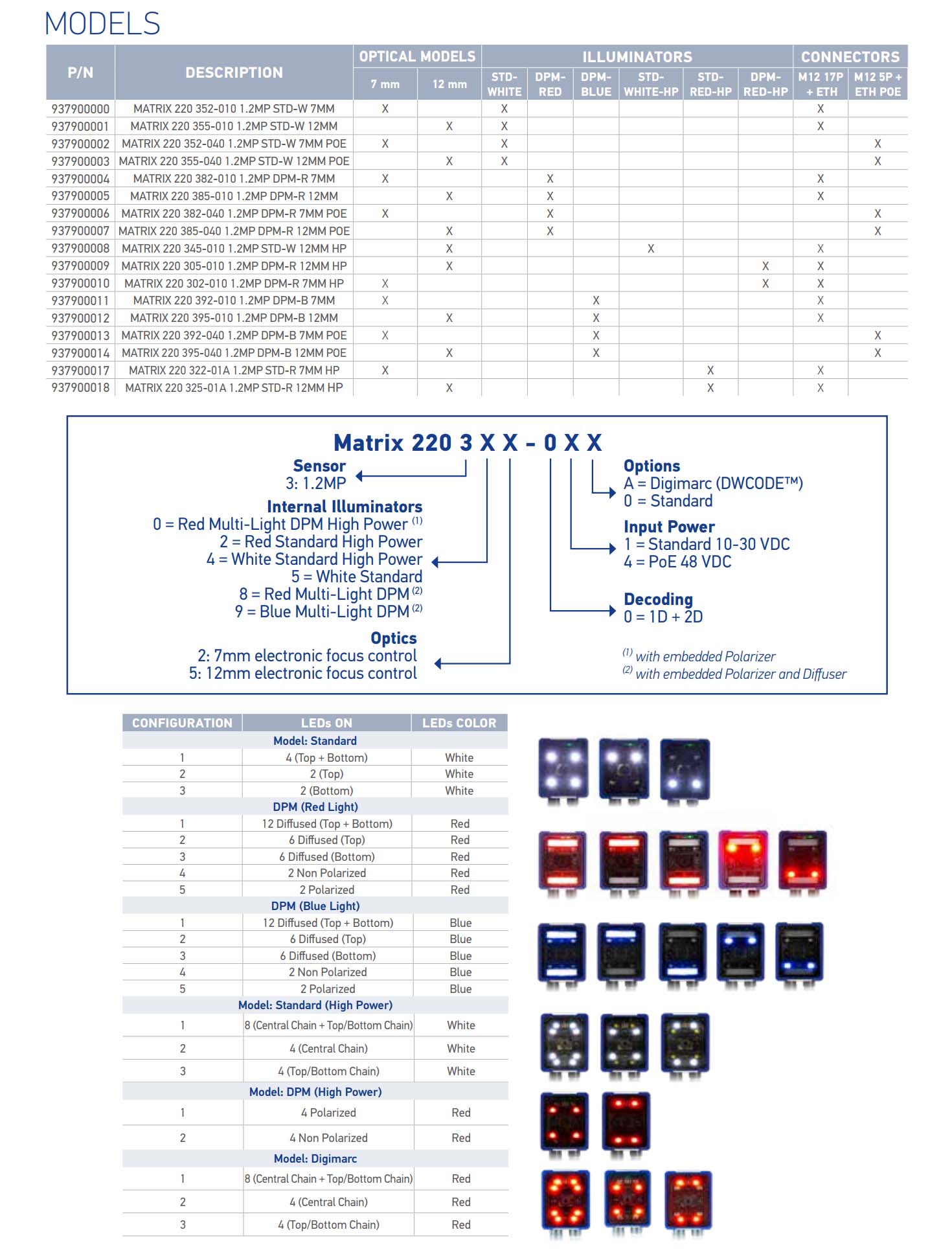 它採用了創新性的光源解決方案,集成了靈活多樣的光源選項,實現了優異的DPM碼(直接部件標識)閱讀能力。Matrix 220可在單一型號中提供偏光和漫射光選項,能夠在任何類型的表面上實現最佳照明。白光和紅光型號不僅性能卓越,還擁有廣泛的應用範圍。電子聚焦控制可以輕鬆實現遠端切換不同的作業配置,擁有極高的使用靈活性。