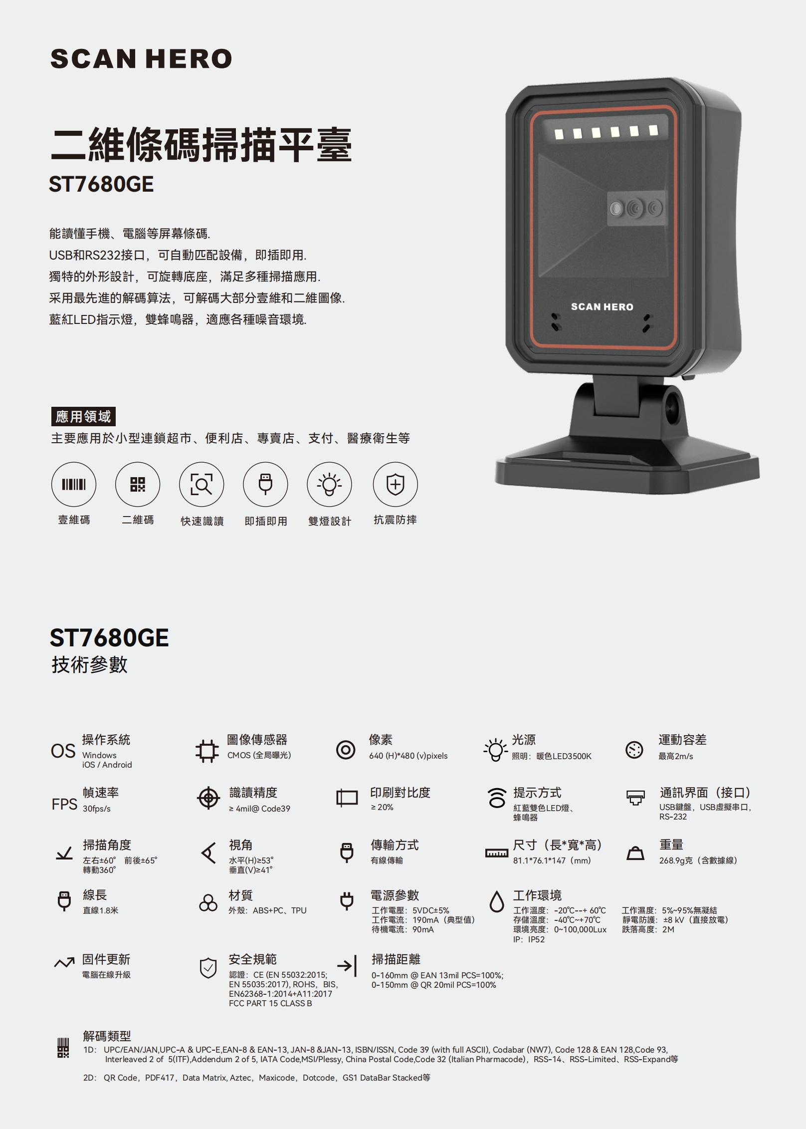 Scanhero ST7680GE 桌面二維條碼掃描器